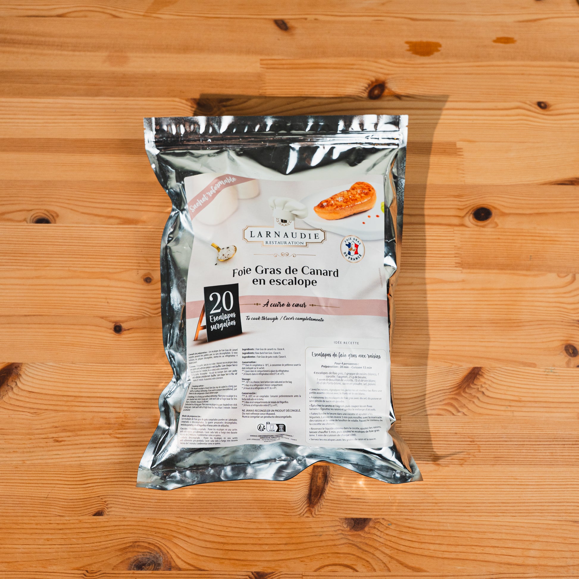 - Type: Escalopes de foie gras de canard crues — raw duck foie gras slices.